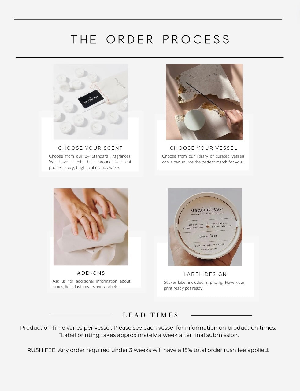 Step 1- Scents: Click the button below to view our scent page for information about our 12 fragrance options. Need samples? Email us at liz@standardwax.com.
